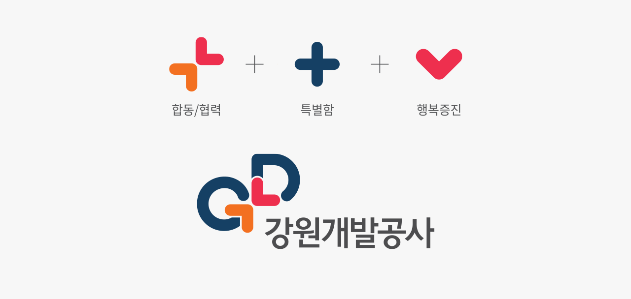 강원개발공사의 새로운 커뮤니케이션 네임인 <GD>를 형상화화 디자인으로 강원 특별자치도와 강원개발공사가 서로 마주보며 도민의 꿈에 가능성을더하고, 삶에 특별함을더하는 강원개발공사를 상징하고 있다.